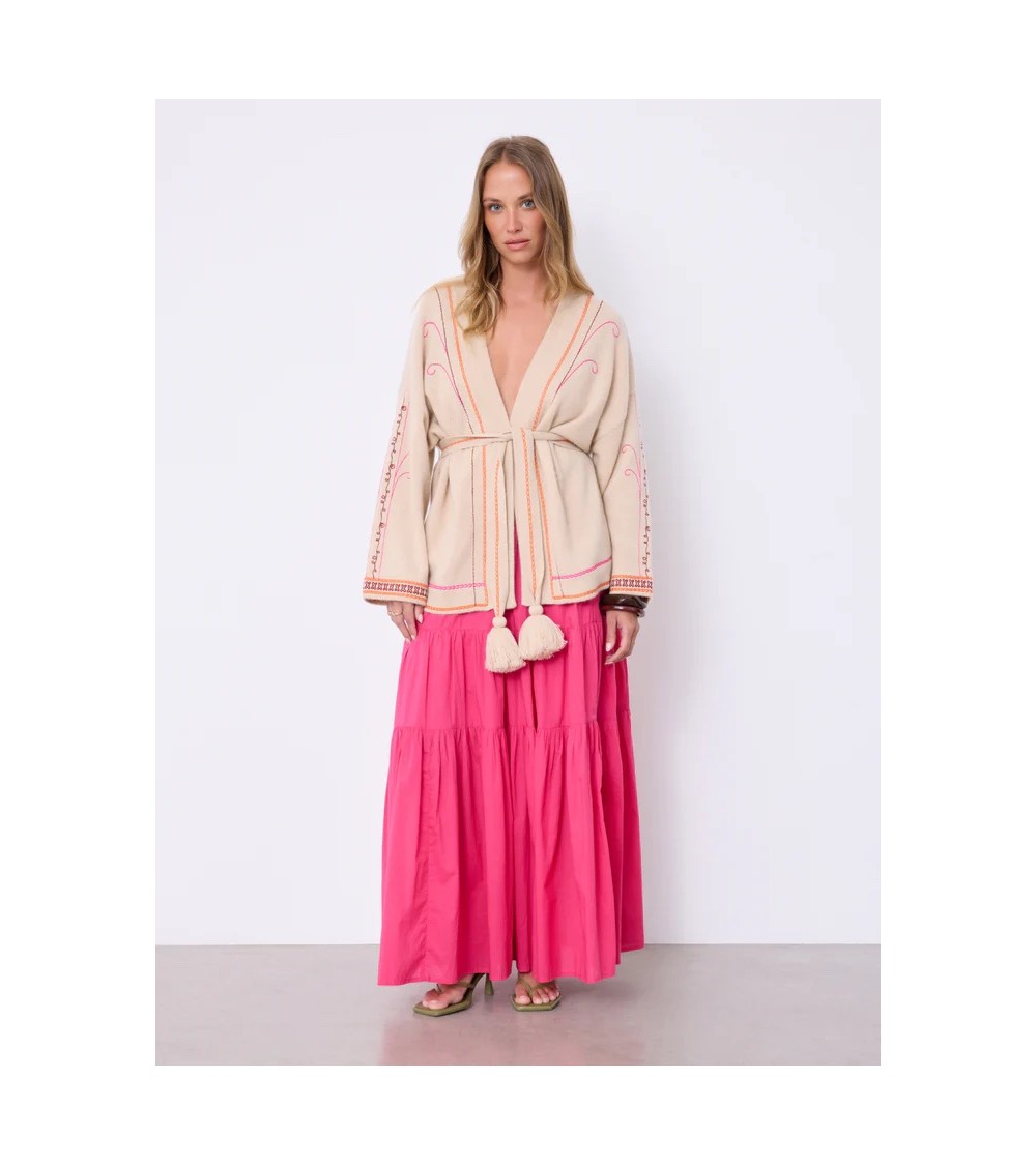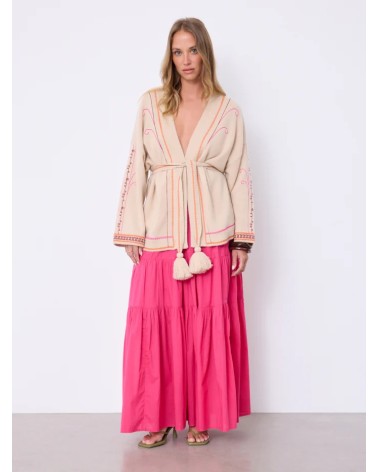 Gilet brodé Not Shy à pompoms, ceinturé